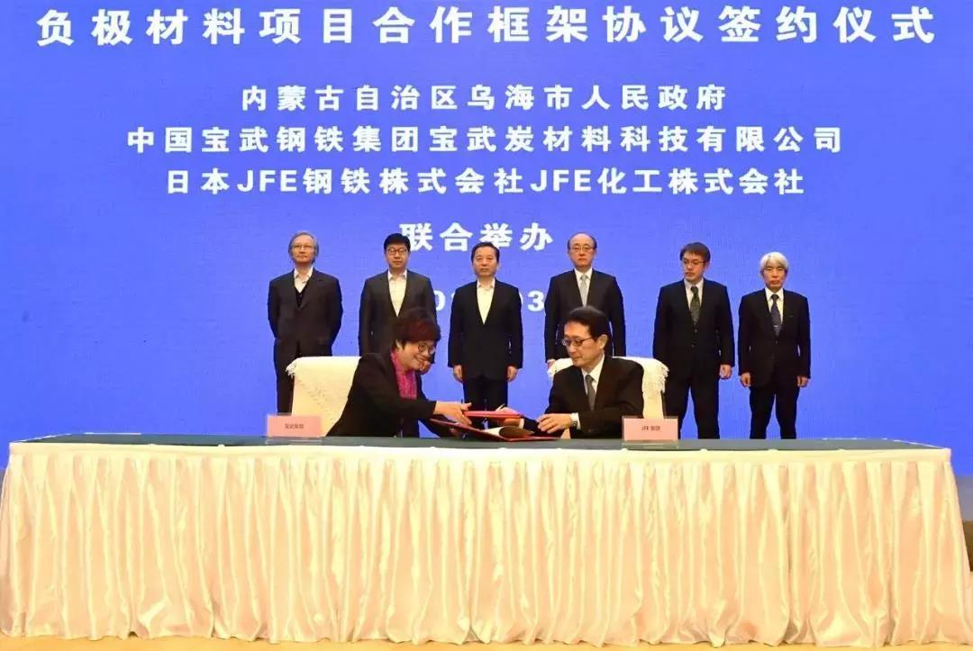 烏海市副市長(zhǎng)包野與寶武炭材總經(jīng)理徐同建代表雙方在焦油資源保障協(xié)議上簽字。寶武炭材黨委書記、董事長(zhǎng)林秀貞與JFE化工社長(zhǎng)鈴木彰代表雙方在3萬噸鋰電池負(fù)極材料項(xiàng)目合作框架協(xié)議上簽字。