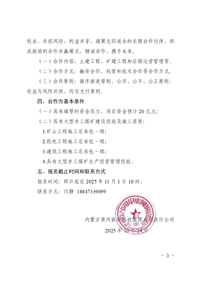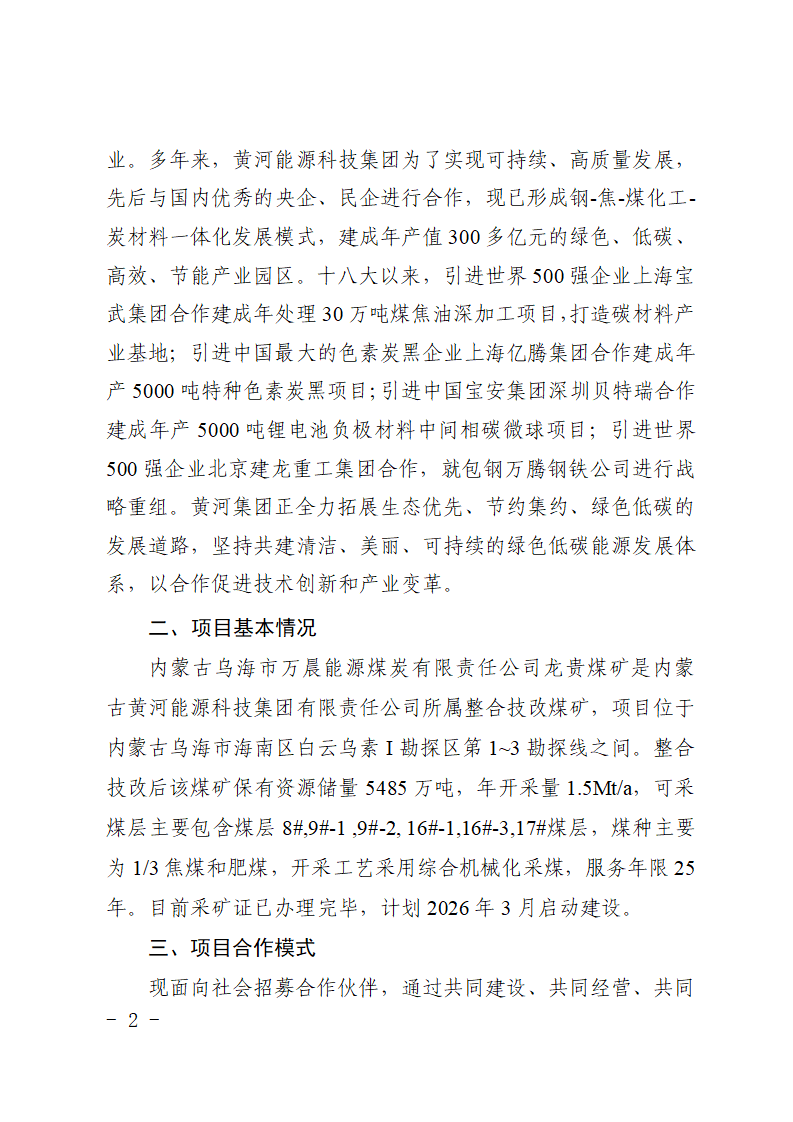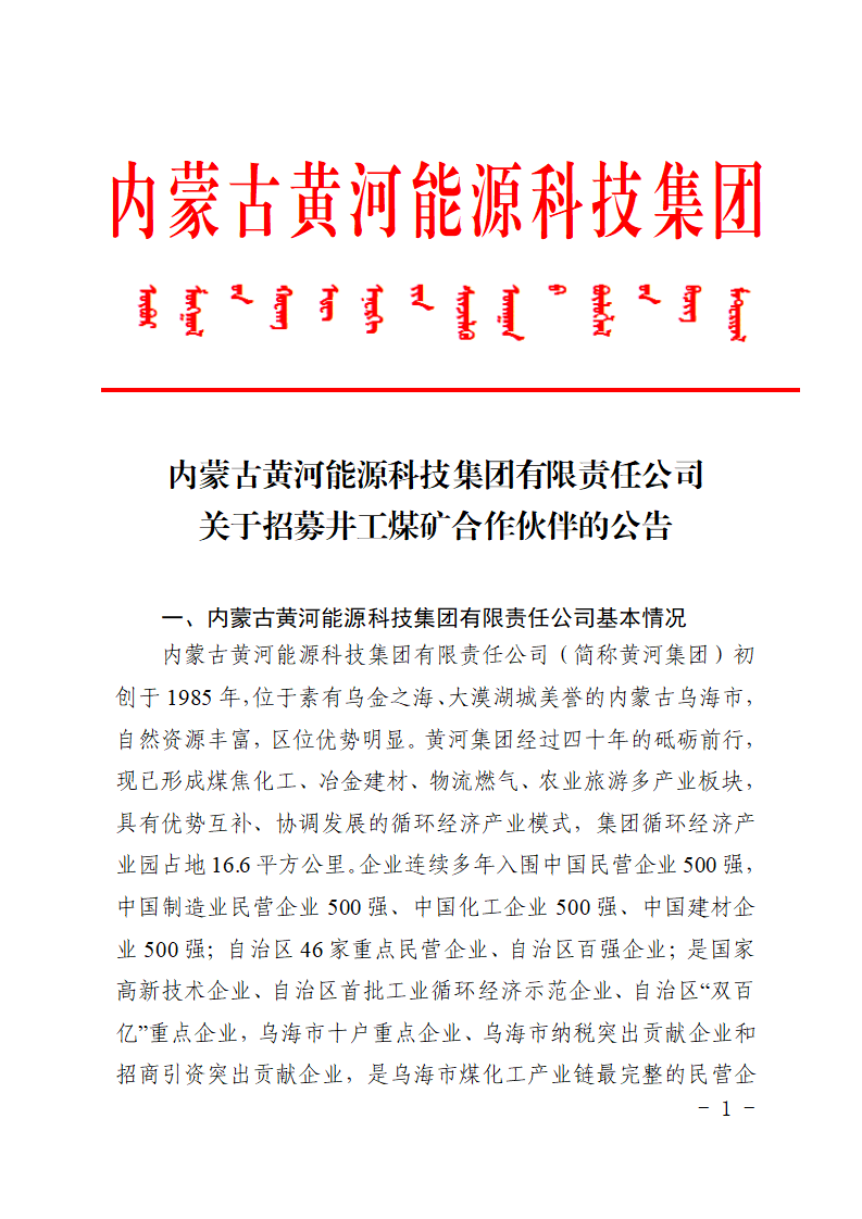 內(nèi)蒙古黃河能源科技集團(tuán)有限責(zé)任公司關(guān)于招募井工煤礦合作伙伴的公告